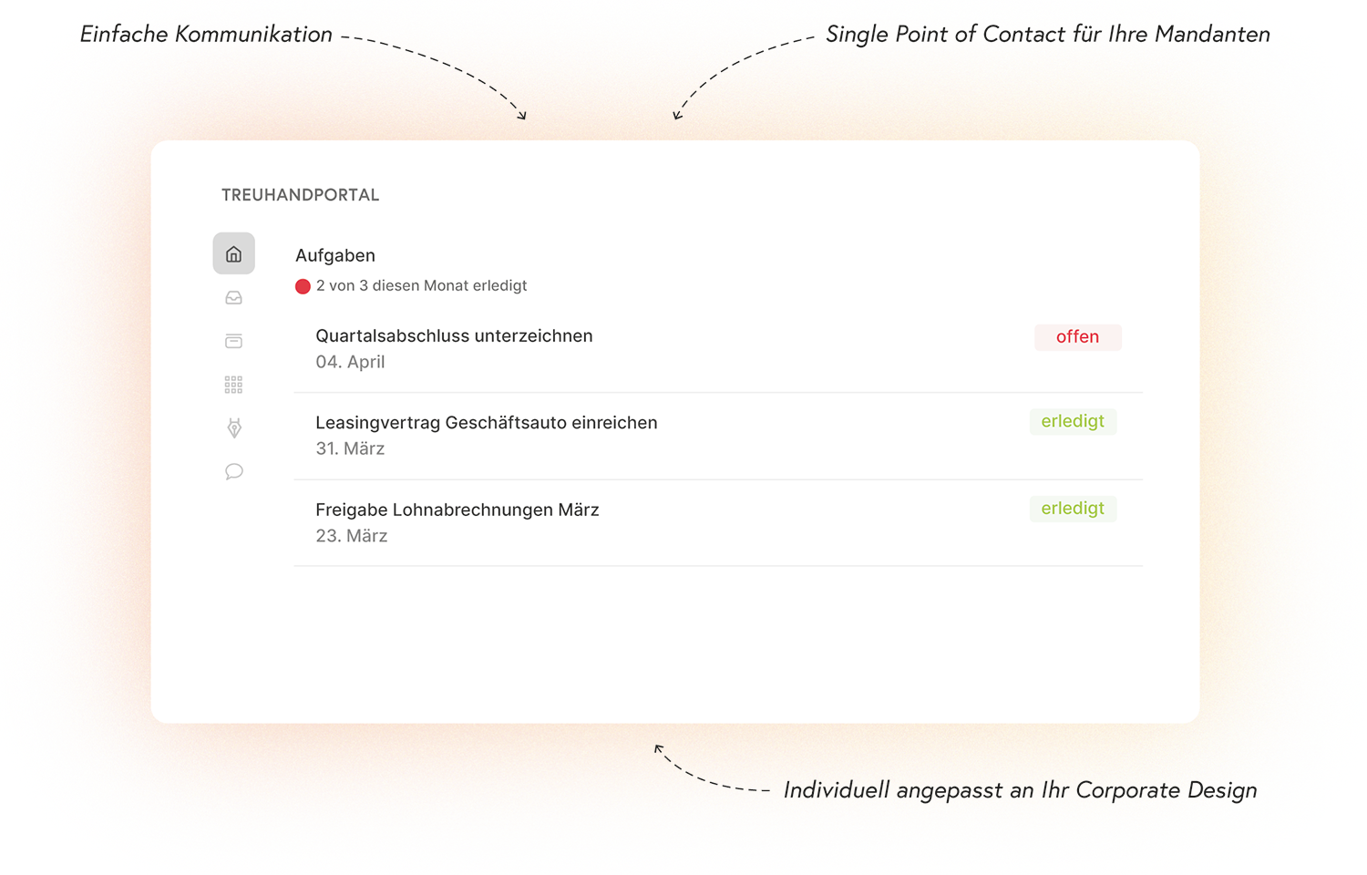 Im Portal können Treuhänderinnen und Treuhänder ihren Kundinnen und Kunden gezielt Aufgaben zuweisen, wie etwa das Nachreichen von Unterlagen für die Steuererklärung. Das aufwändige Hin- und Herschicken von Dokumenten gehört der Vergangenheit an. Gleichzeitig lassen sich klare Fristen definieren, sodass Kundinnen und Kunden wissen, bis wann Sie ihre Dokumente spätestens im Portal hochladen müssen.